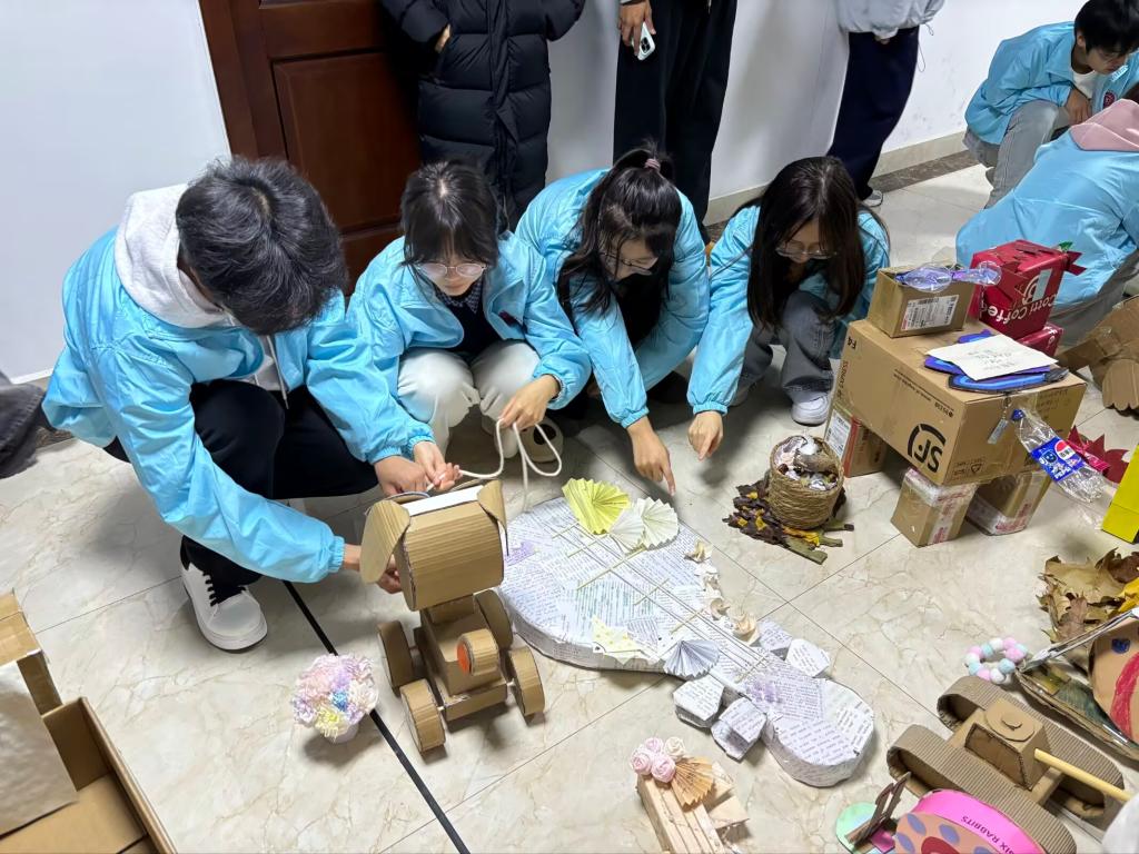 宿舍手工大赛的现场,同学们化身“创意设计师”,将废旧纸箱、空瓶罐、旧布料等看似无用的材料,通过剪裁、拼接、彩绘等方式改造为可爱的宠物,一件件作品不仅展现了学子们出色的动手能力,更将绿色环保的生活理念融入创作,让“低碳生活”在宿舍里落地生根。
