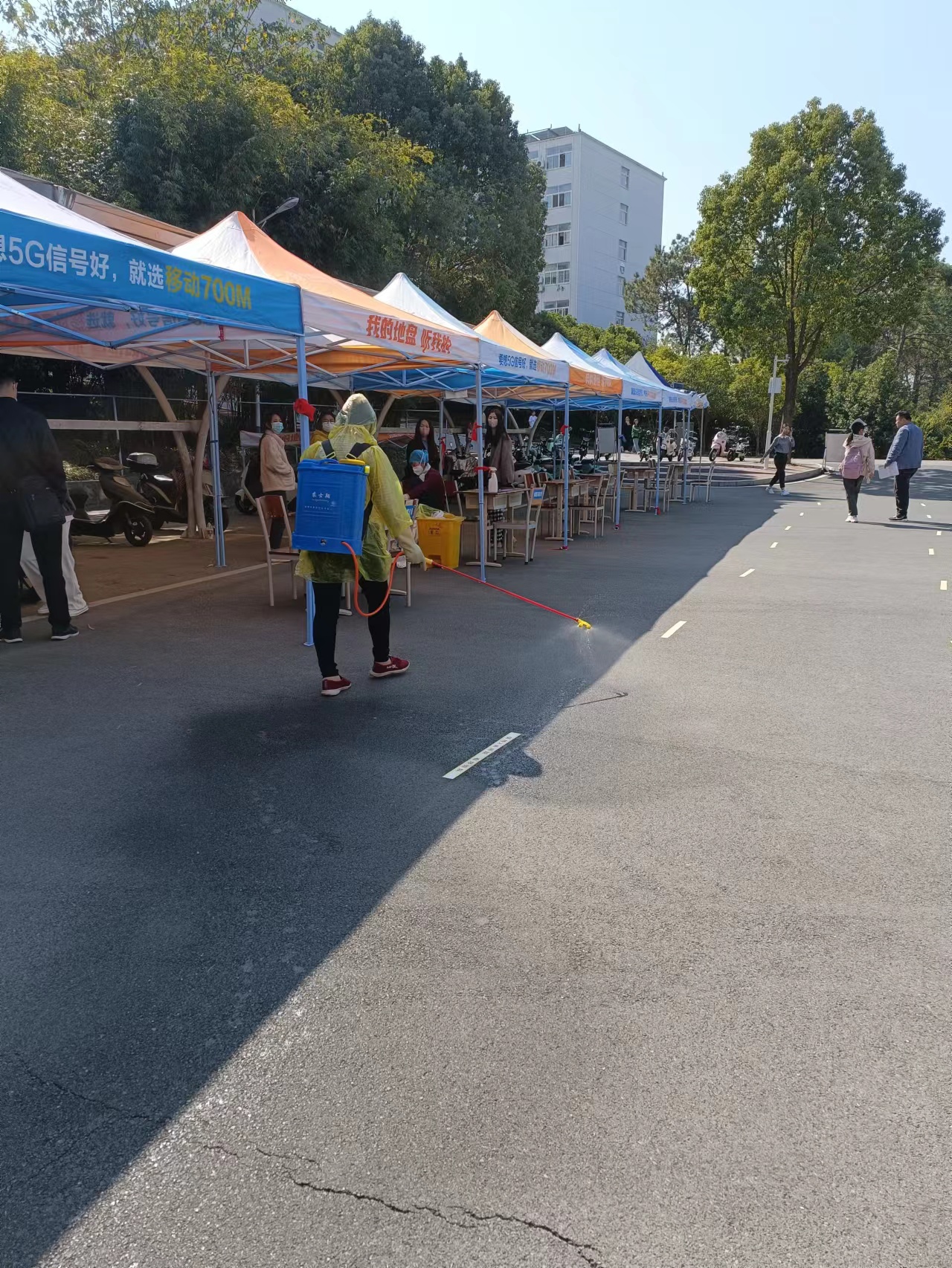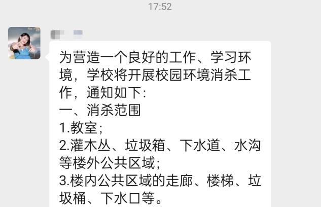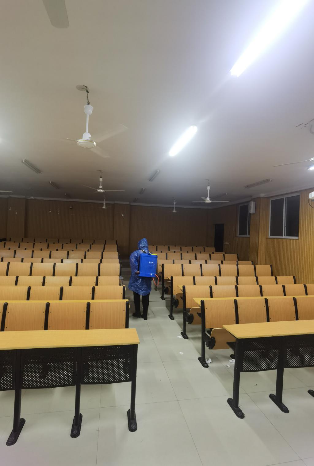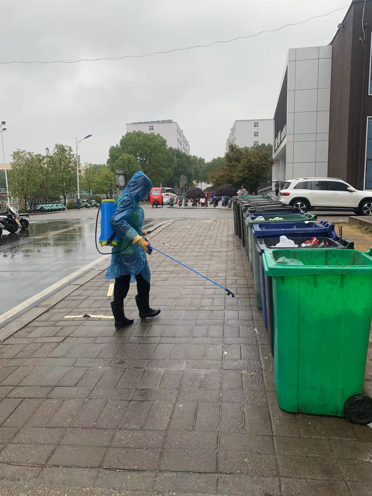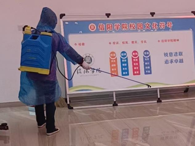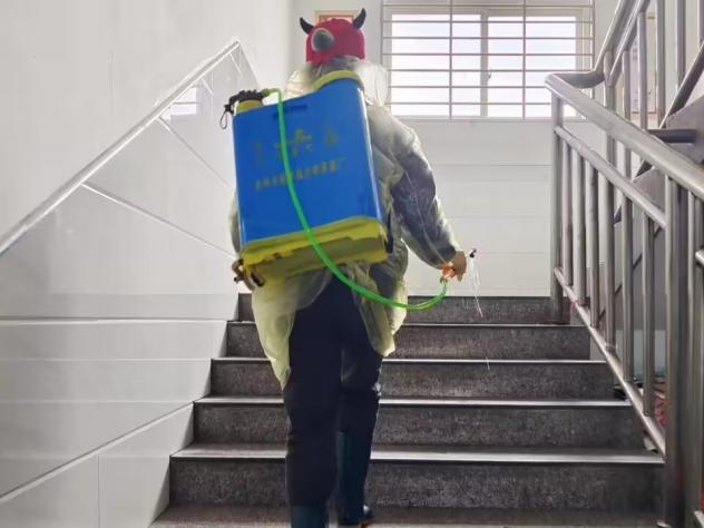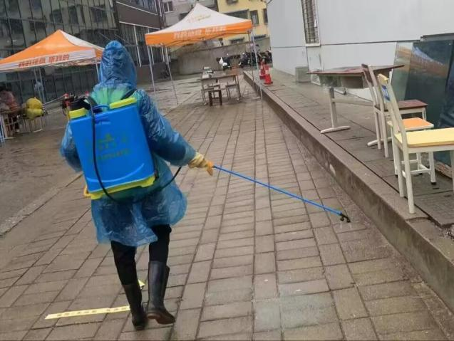 宿管阿姨在楼道内、宿舍楼外落实消杀工作