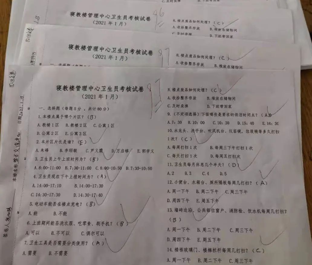 测评结束后,寝教楼管理中心老师第一时间批改出试卷,并对试卷进行全面的分析,表彰先进,鞭策落后。针对本次测评暴露出的问题,做好汇总,年后将逐一谈话解决。希望全体人员通过此类的业务测评发现自己的不足,更加全面的了解寝教楼的工作,今后更加热情的服务好全校师生。
