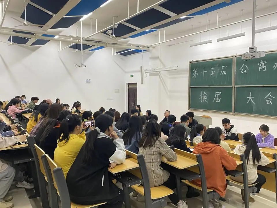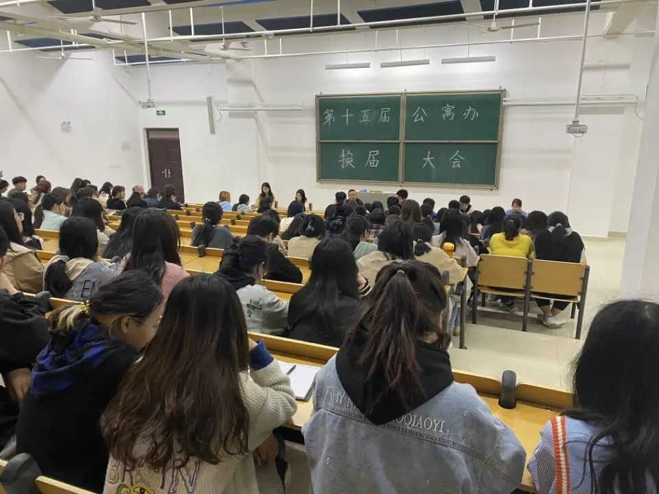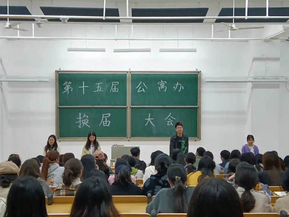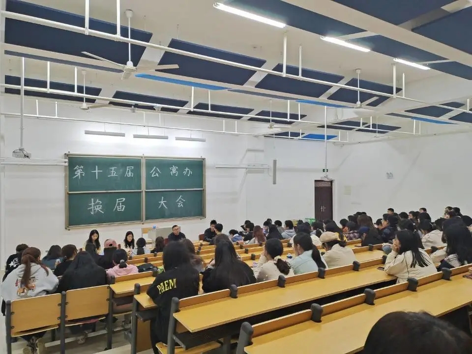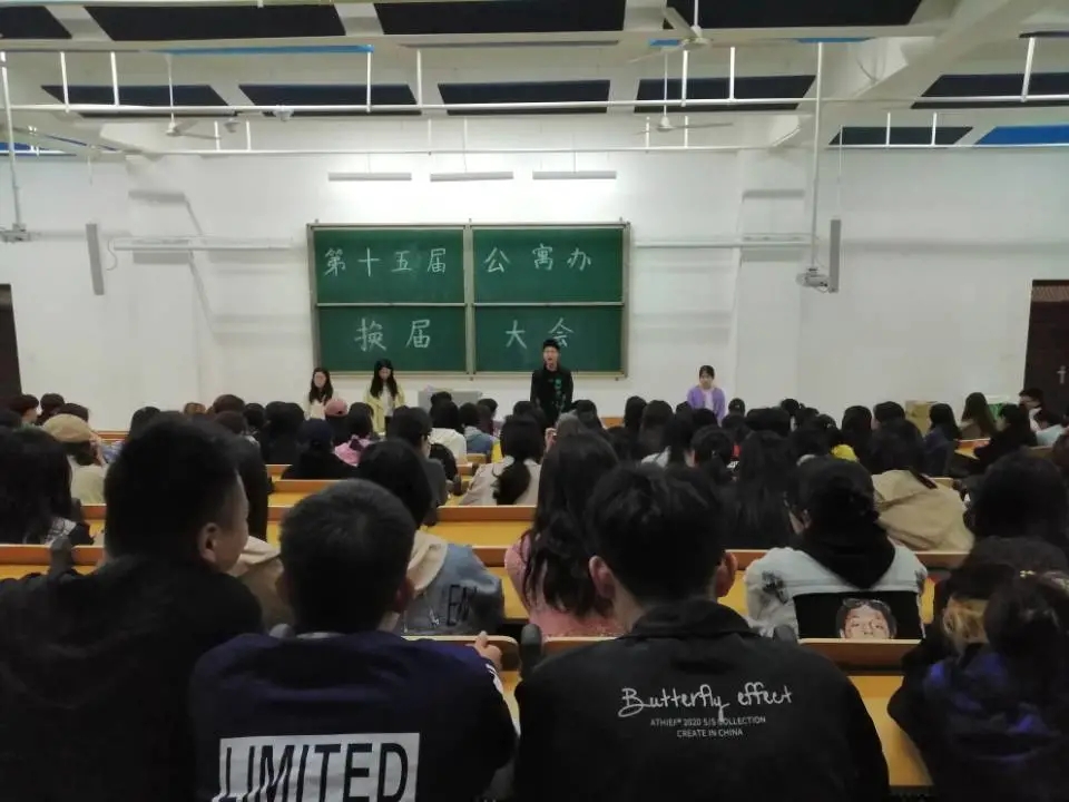 2021年3月30日12点30分,第十五届公寓办换届大会在综合楼202教室举行。出席人员有万圆圆老师,总负责人张龙海,分管负责人朱雪倩、秦玉霞、贾文静、钟雪诚、各部门部长、副部长及所有干事。