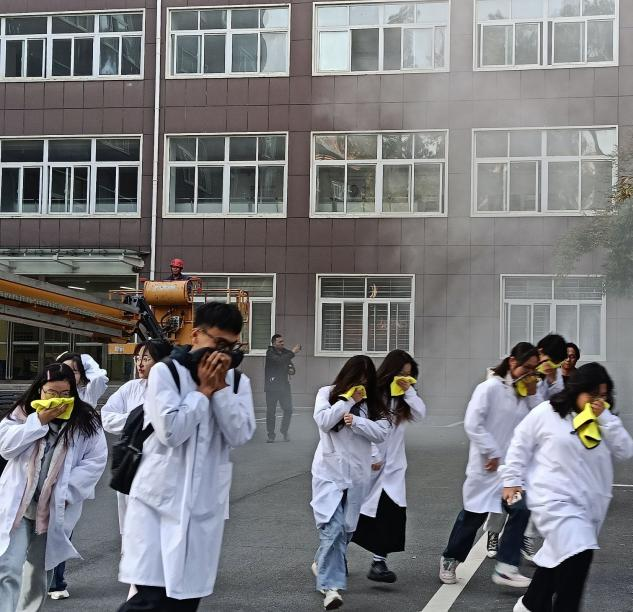 此外,还在理工楼和实验楼进行了模拟实验楼生烟的疏散练习,师生们模拟了从1楼通过逃生通道和从三楼通过云梯两种不同情况下的逃生救援。在理工楼北侧草地灌木丛,师生们进行了森林防火快速反应及灭火演练,学习了如何使用消防水带、消防水枪和消防扳手等工具。