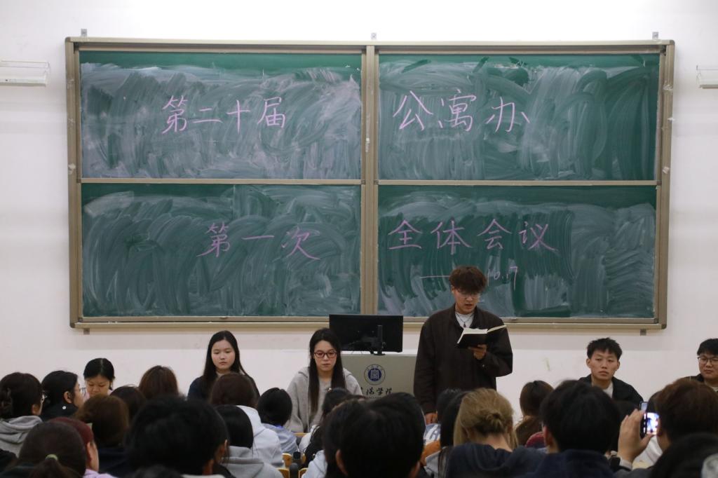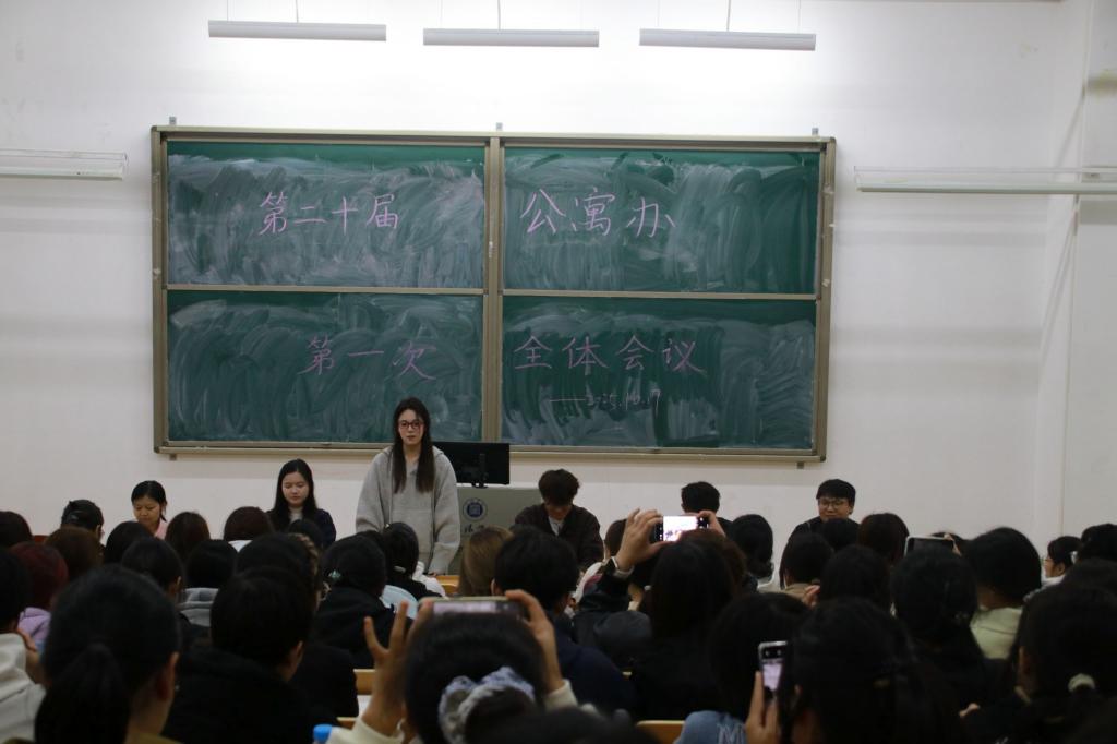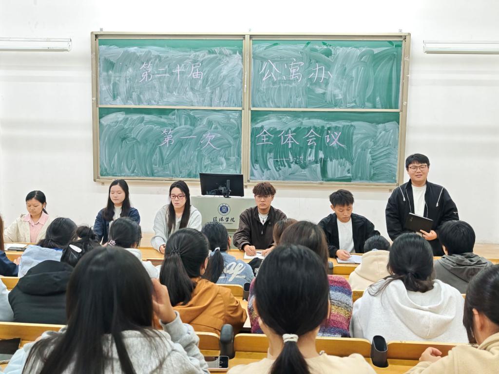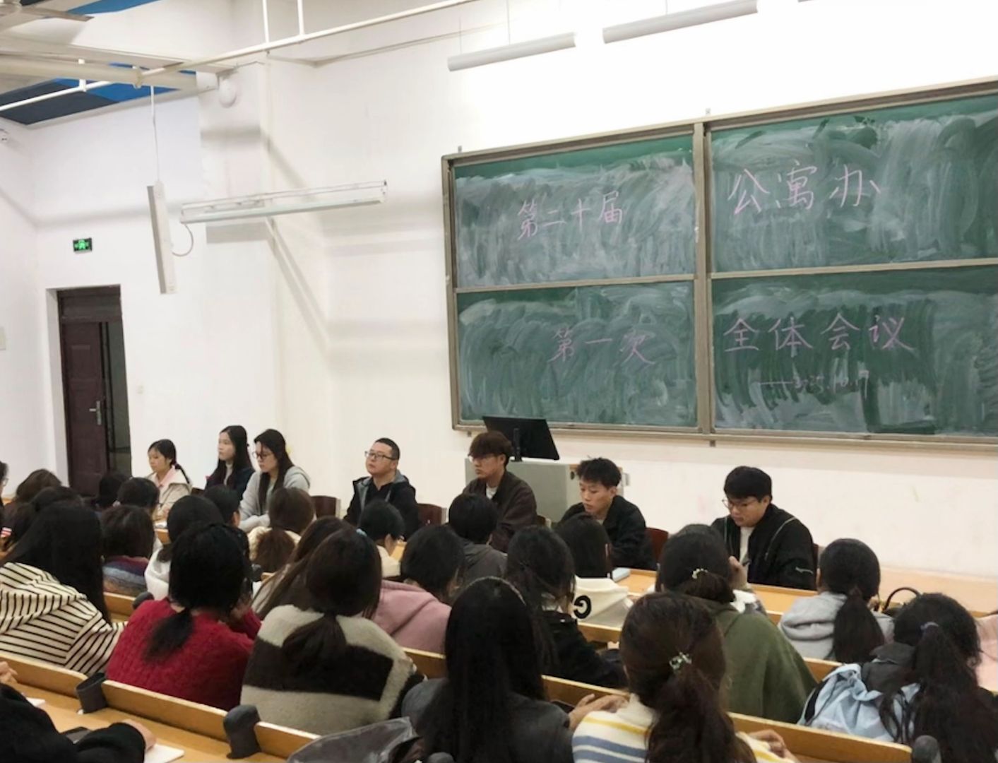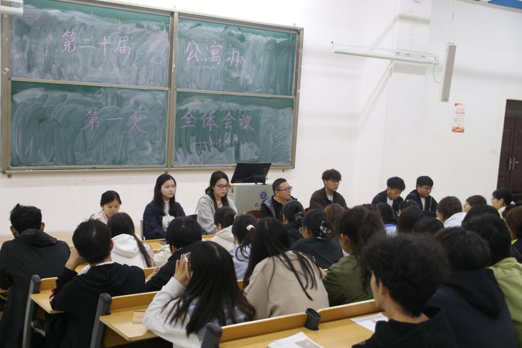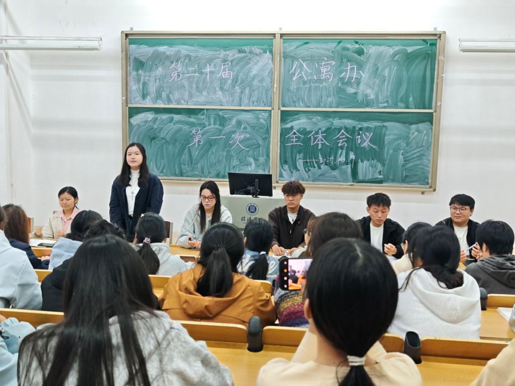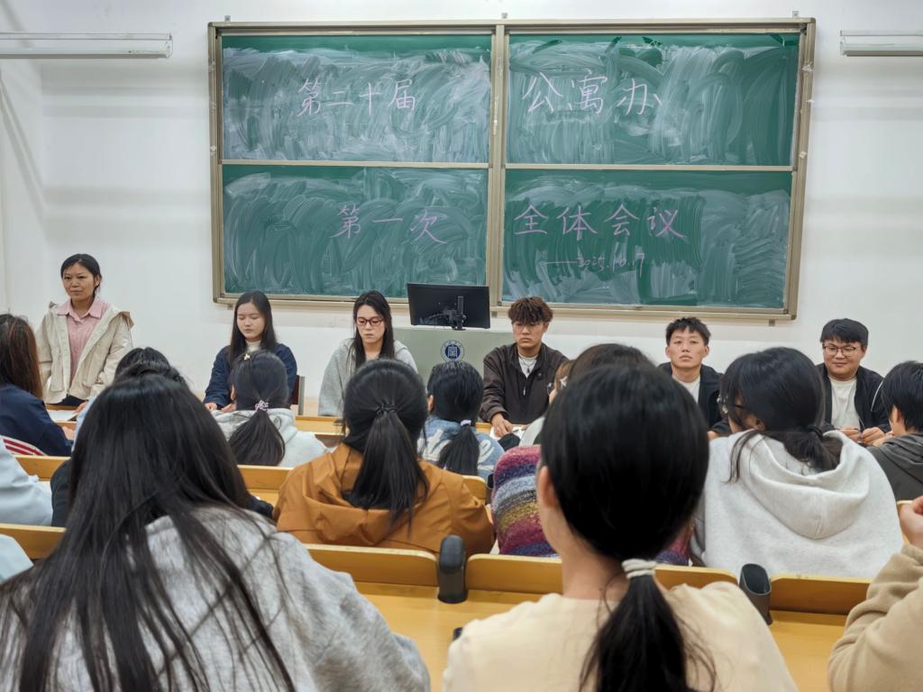 2025年10月17日晚上7点,公寓办第二十届第一次全体会议在综合楼202教室召开。万圆圆老师和总负责人郭恒,分管负责人戴静雯、李岩、陈帅旗、郭森、郑宇航,各部门部长、副部长,以及25级全体干事参与了会议。