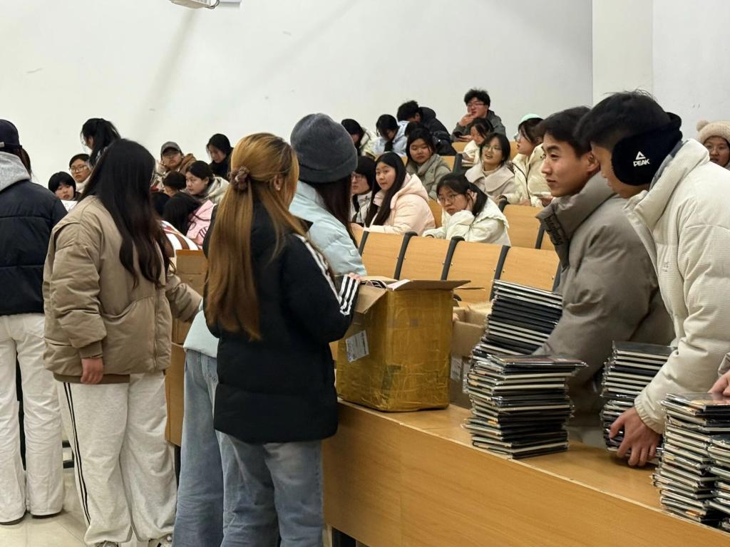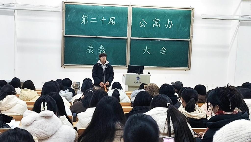 2025年12月27日晚七点,信阳学院公寓办表彰大会在综合楼202教室顺利举行,出席人员有总负责人郭恒,各分管负责人戴静雯、李岩、陈帅旗、郭森、郑宇航,各部门部长、副部长及全体干事。本次活动旨在总结这一学期公寓办各项工作的工作情况,并依据积分量化为各部门部长及干事分发礼品。