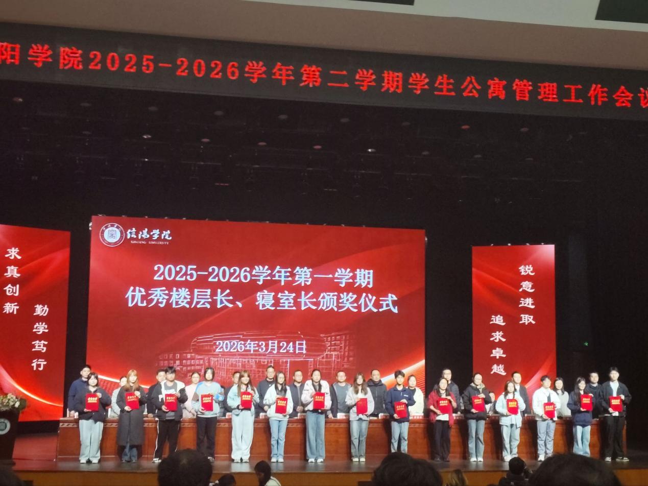在此次会议上,代表张猛宣读《信阳学院关于2025-2026学年第一学期优秀寝室长、楼层长的决定》、《信阳学院关于聘任2025-2026学年第二学期学生公寓寝室长、楼层长的决定》,对优秀寝室长(楼层长)代表颁发证书,对新任寝室长(楼层长)代表授予聘书。计算机与人工智能学院辅导员杨韫幔老师发言和学生工作处余婷婷处长讲话的重点在于学生公寓安全问题和卫生问题。